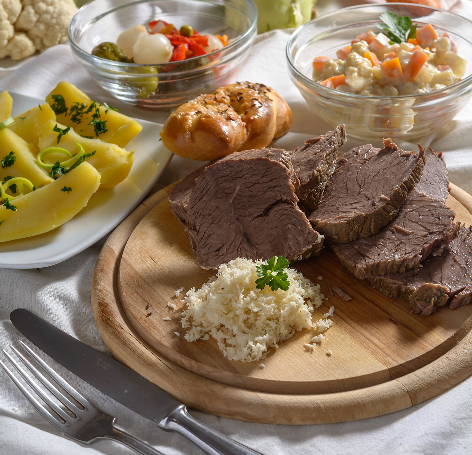 Maso vložíme do vařící vody, osolíme a vaříme do měkka. Očištěnou karotku a kedlubny nakrájíme na kostky a zalijeme vývarem z hovězího masa. Vývaru dáme jen tolik, aby zelenina nebyla celá potopená. Když je poloměkká, přidáme na růžičky rozdělený květák.