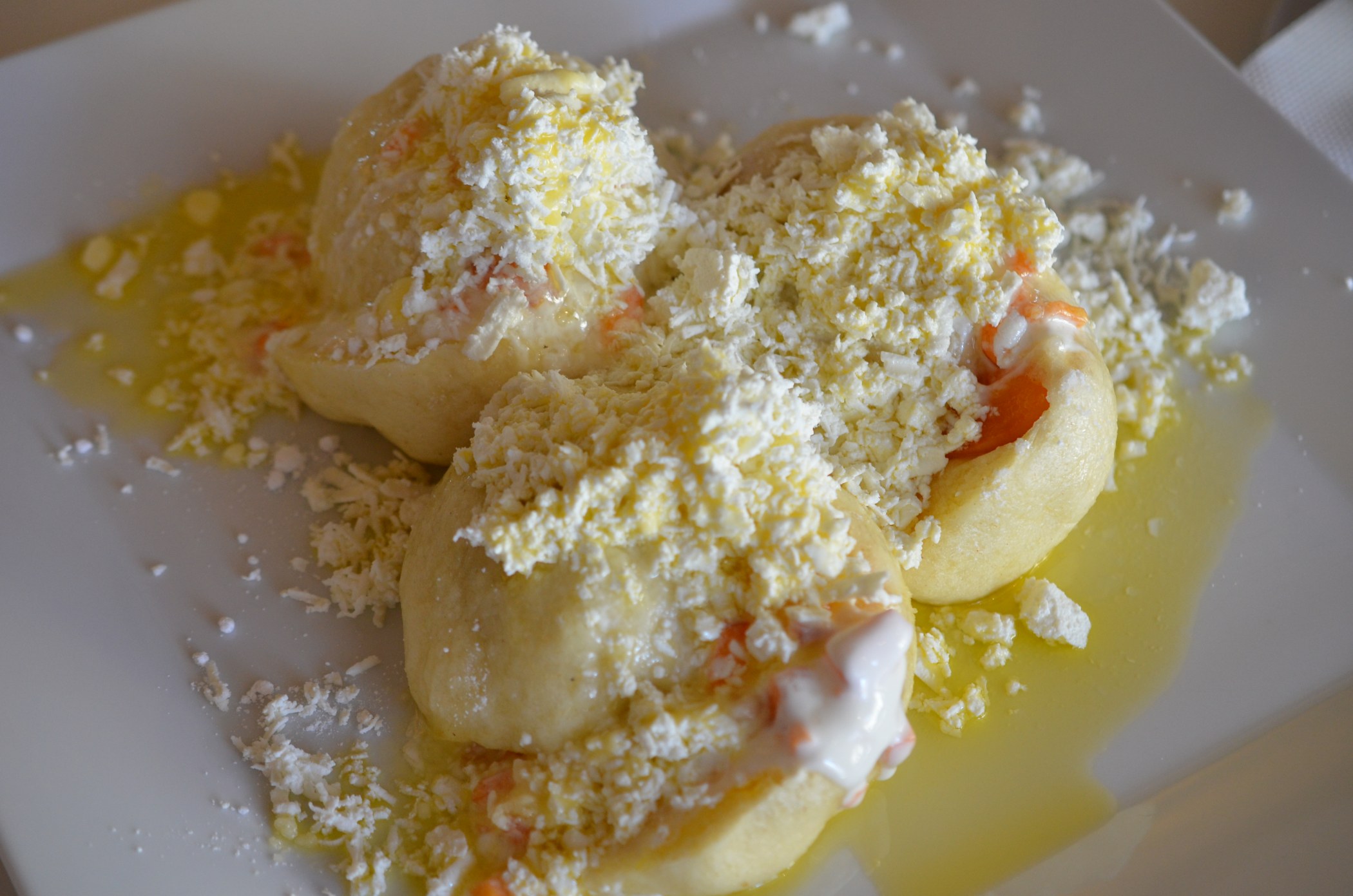 Klasikou je nastrouhaný tvrdý tvaroh, moučkový cukr a zakápnout můžete rozpuštěným máslem. Knedlíky se sypou i mákem, ořechy, kokosem, mandlovými lupínky, hoblinkami čokolády nebo griliášem. My jsme k nim dostali navíc cosi ve dvou malých omáčnících: „Je to přepuštěné máslo a meruňková omáčka z kysané smetany, cukru a posekaných čerstvých meruněk,“ láká nás ke stolu kuchař Michal Pitek.