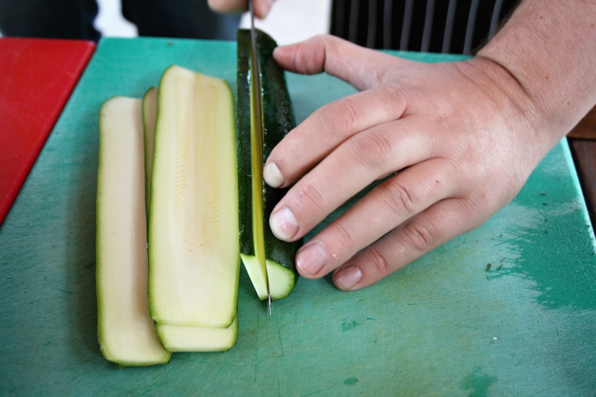 - Z opláchnutých cuket odřízneme na obou stranách konce a podélně je překrojíme.